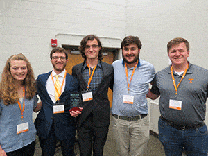 After a two year pause due to the COVID pandemic, the Tickle College of Engineering held its annual college-wide senior design showcase in person on May 6 in the Zeanah Engineering Complex. Over 130 team projects representing all eight engineering departments were on public display. Forty-nine of those team projects were from MABE students. Eight mechanical engineering senior design teams designed and built remote-controlled robots that battled each other in MABE’s first annual BattleBots competition which was held separate from the showcase.