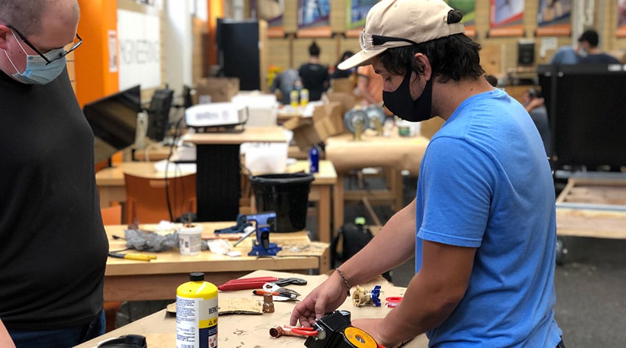 They attach a sink to the water-heater system and celebrate with an informal hand-washing party—a part of the process more relevant than ever this semester. Social distancing was observed throughout the build.